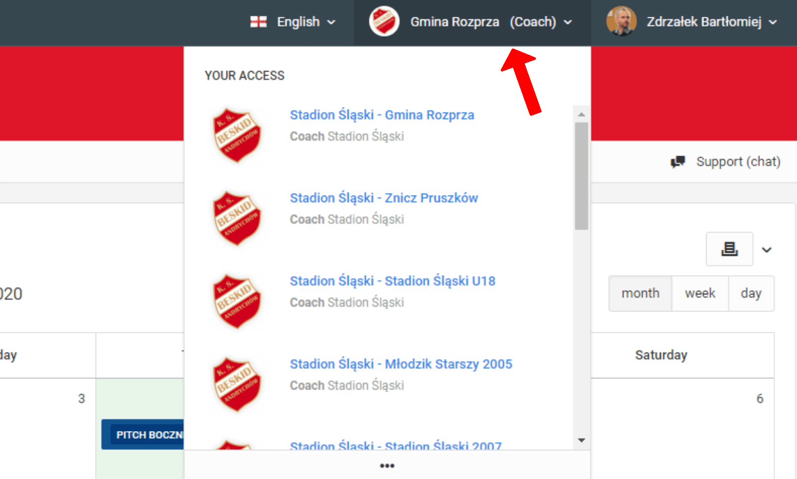 Das System gibt Ihnen die Möglichkeit, mehr als eine Rolle zu haben. Das bedeutet, dass Sie mit einem Login und Passwort das System als: Elternteil, Spieler, Trainer, Koordinator oder Hauptadministrator des Vereins nutzen können. Um zwischen Ihren Rollen zu wechseln, klicken Sie auf den Button mit Ihrer aktuell geladenen Rolle in der oberen rechten Ecke. Der nächste Schritt ist die Auswahl der Rolle, die Sie als aktiv laden möchten. Ein Rollenwechsel kann zu einer Änderung der Zugriffsebene im System führen. Eine detailliertere Liste der Rollen finden Sie im linken Menü unter "Zugriffe".