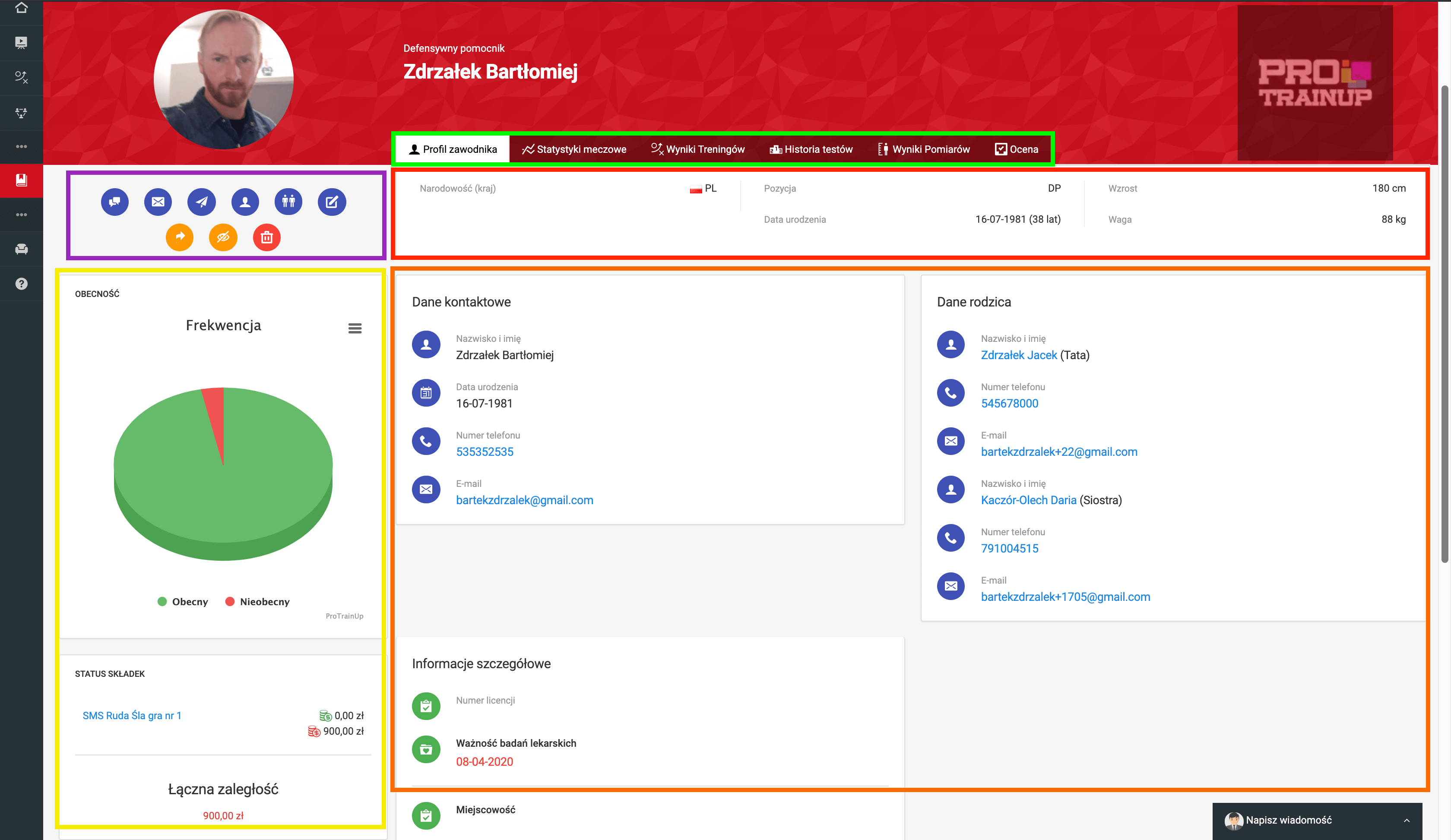 Das Profil eines Spielers besteht aus mehreren Abschnitten, die im obigen Bild farblich gekennzeichnet sind. Grün ist eine Liste von Lesezeichen, auf die Sie klicken können, um zum entsprechenden Abschnitt des Spielerprofils zu gelangen. Violett ist das Funktionsmenü, mit dem Sie Aktionen wie Profil bearbeiten, Profil löschen, Spieler verbergen, ihm eine private Nachricht oder E-Mail senden können. Rot ist der Bereich, der die metrischen und anthropometrischen Daten des Spielers zeigt. Gelb ist der Bereich mit Informationen über Anwesenheit und Beitragsbemerkungen. Orange ist der Bereich mit den persönlichen Daten des Spielers und seiner Eltern.