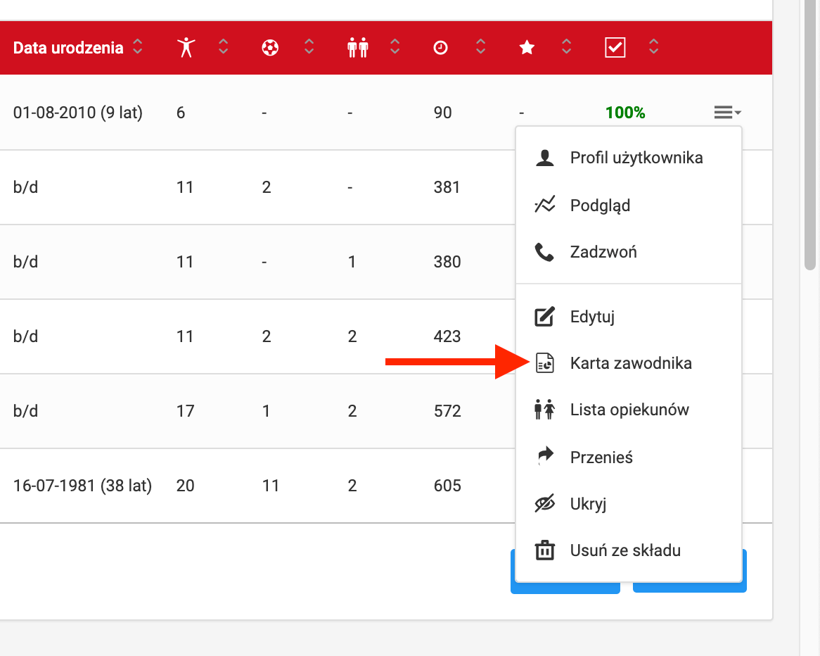 Jeder Spieler im System hat ein automatisch generiertes Profil und eine Spielerkarte. Beide Registerkarten sammeln die wichtigsten Daten über den Spieler in der ausgewählten Saison. Um zum Profil des Spielers zu gelangen, müssen Sie die Spielerliste aufrufen und auf den Namen des Spielers klicken.