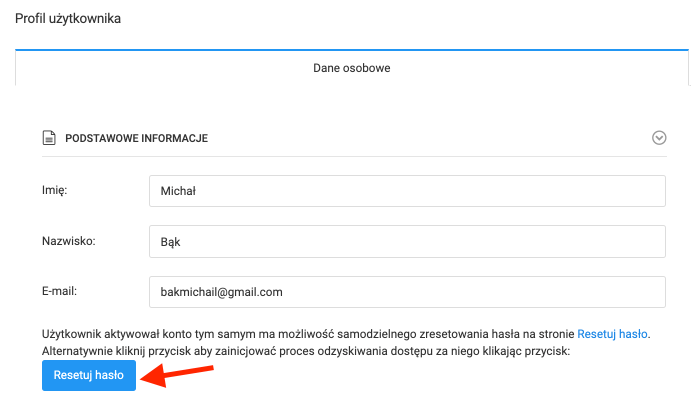 Aby wywołać funkcję resetu hasła z poziomu okna edycji profilu zawodnika, musisz kliknąć w niebieski przycisk "resetuj hasło". Jego kliknięcie spowoduje wysłanie wiadomości e-mail na adres zawodnika, z instrukcją i linkiem do okna resetu hasła.